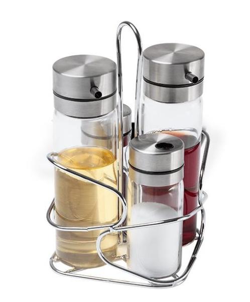 Atributos: Leve funcionalidade, design e charme para a hora de servir com o Galheteiro para vinagre, azeite sal e pimenta, Cucina da linha Parma que, possui Suporte em Aço Inox, durável, resistente e fácil de limpar. Além disso conta com 4 recipientes de Vidro e tampa de Inox, práticos, e com capacidade para 200 mls no azeiteiro e vinagreiro e 100 mls no saleiro e pimenteiro.
