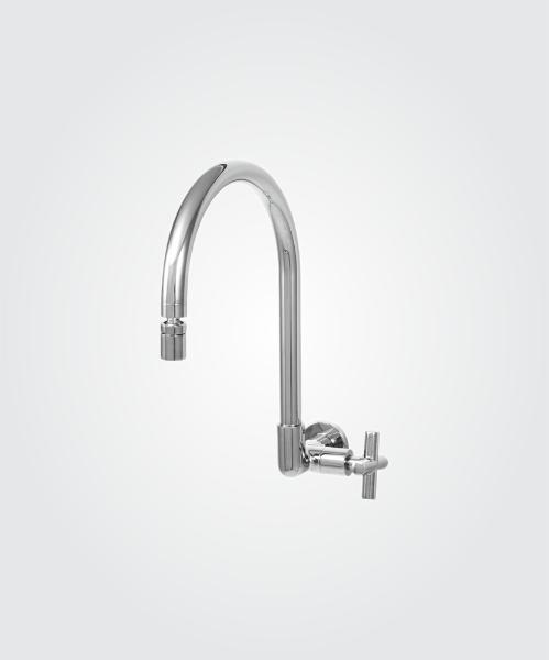 Atributos: Torneira metálica robusta com design moderno combinando formas circulares.